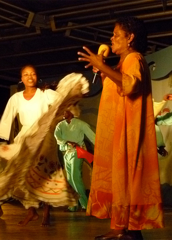 Historically this music occupied a specific place in the lives of Afro-Ecuadorians, played at Catholic saint festivals and for secular entertainment at weekly dances, but today it is performed almost exclusively by amateur and professional folklore groups at large festivals and at beach resorts. These folklore groups first began forming in the early 1970s, when an elder generation of musicians grew concerned that not enough young people were learning to sing and dance the marimba tradition, due in part to mestizo antipathy towards Afro-Ecuadorian traditions, as well as to the slow incursion of foreign popular musics. Petita Palma formed one such group, “Tierra Caliente,” in 1972, and set out to train young singers and dancers through participation in her ensemble (see Figure 8.8). Hundreds of local performers have now passed through the ranks of her group and others, and many have gone on to found their own folklore troupes, both in Esmeraldas and in other towns and cities. Thanks to their collective efforts, the marimba has emerged in recent years as one of the principal symbols of a resurgent sense of ethnic and racial pride among Afro-Ecuadorians. One of the largest public celebrations in Esmeraldas is now the annual marimba festival held during Carnival in February, drawing thousands of spectators.