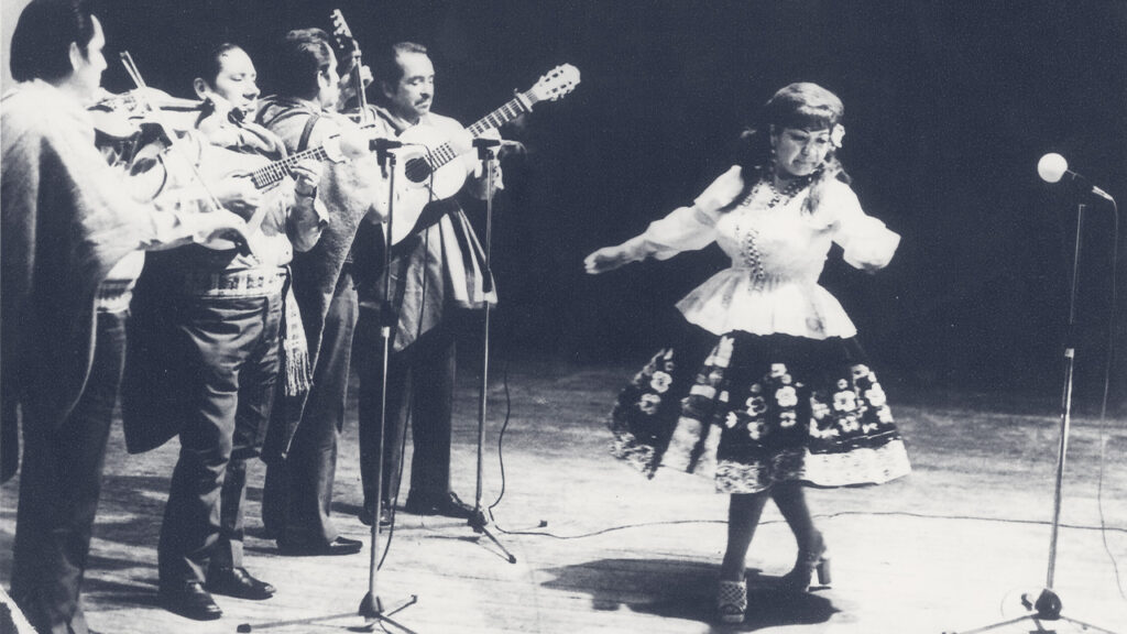 These names reflected the kind of rural persona promoted in the music—similar to that of urban country music in the United States—and also reflected the continued importance of regional identities among migrants. Singers chose specific places from their home areas as part of their stage names, and reinforced that association by wearing folkloric clothing. Most importantly, they also chose their backup ensemble to reflect a particular region. El Picaflor de los Andes (Víctor Alberto Gil, 1929–1975), for instance, came from the Mantaro Valley, located east of Lima, and employed a saxophone orchestra from that region. Pastorita Huaracina (María Alvarado Trujillo, 1930–2001) migrated from the Ancash region, and performed with a string band representative of mestizo practices there (Figure 8.11), while the trio Lira Paucina (The Lyre from Pauza) played the guitars and charangos associated with southern Ayacucho. Audiences for such groups, however, came from areas all over the highlands.
