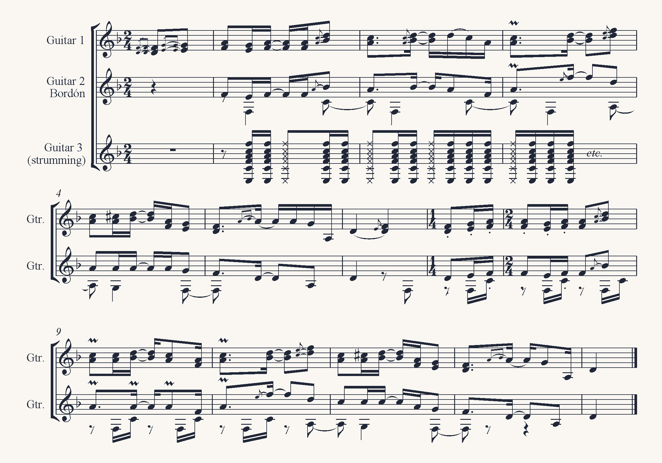 Nonetheless, part of the pride exhibited in the prominence of the guitar in Ayacuchan music is the technical difficulty of the regional style. One of its key features rests on the ability of the guitarist to simultaneously play a syncopated bass line, called the bordón, on the lower strings, while the other fingers pluck out a melody or strum on the upper strings. In the hands of a skilled guitarist, one guitar can sound like two or three playing at the same time. Other traits of the Ayacuchan mestizo style include extensive sixteenth-note passages in the introduction to most songs, or during instrumental breaks between verses, and frequent harmonization of the melody played on the upper strings, paralleling the vocal harmony (see Example 8.2). Mastery of this style is complicated by the presence of multiple guitar tunings corresponding to different genres that make playing their respective bordones (bass lines) easier.