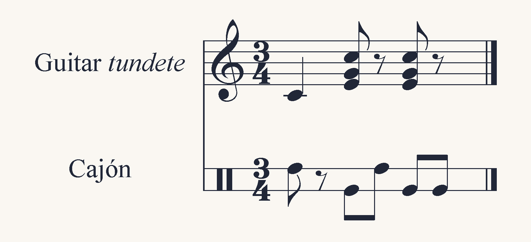 Though musicians played many types of music at jaranas, including the marinera, a syncopated 6/8 couple dance widely regarded today as Peru’s national dance (closely related to the Chilean and Bolivian cueca), the most popular genre at the turn of the twentieth century was the vals. A modified version of the European dance, Peruvian valses (as with their northern cousin, the Ecuadorian pasillo) maintained the genre’s 3/4 meter, but unlike the primarily instrumental European waltz, the vals was meant to be sung. Singers performed with one or more guitarists who played variations on a stock rhythm known by the onomatopoeic term tundete. Beginning with the thumb playing a bass note on beat one (the “tun”), guitarists then pluck and quickly dampen a chord on the top strings on beats two and three (“de-te”; see Example 8.3). Later in the mid-twentieth century, performers added the Afro-Peruvian cajón (wooden box drum; see Figure 8.9) as standard accompaniment for the vals.