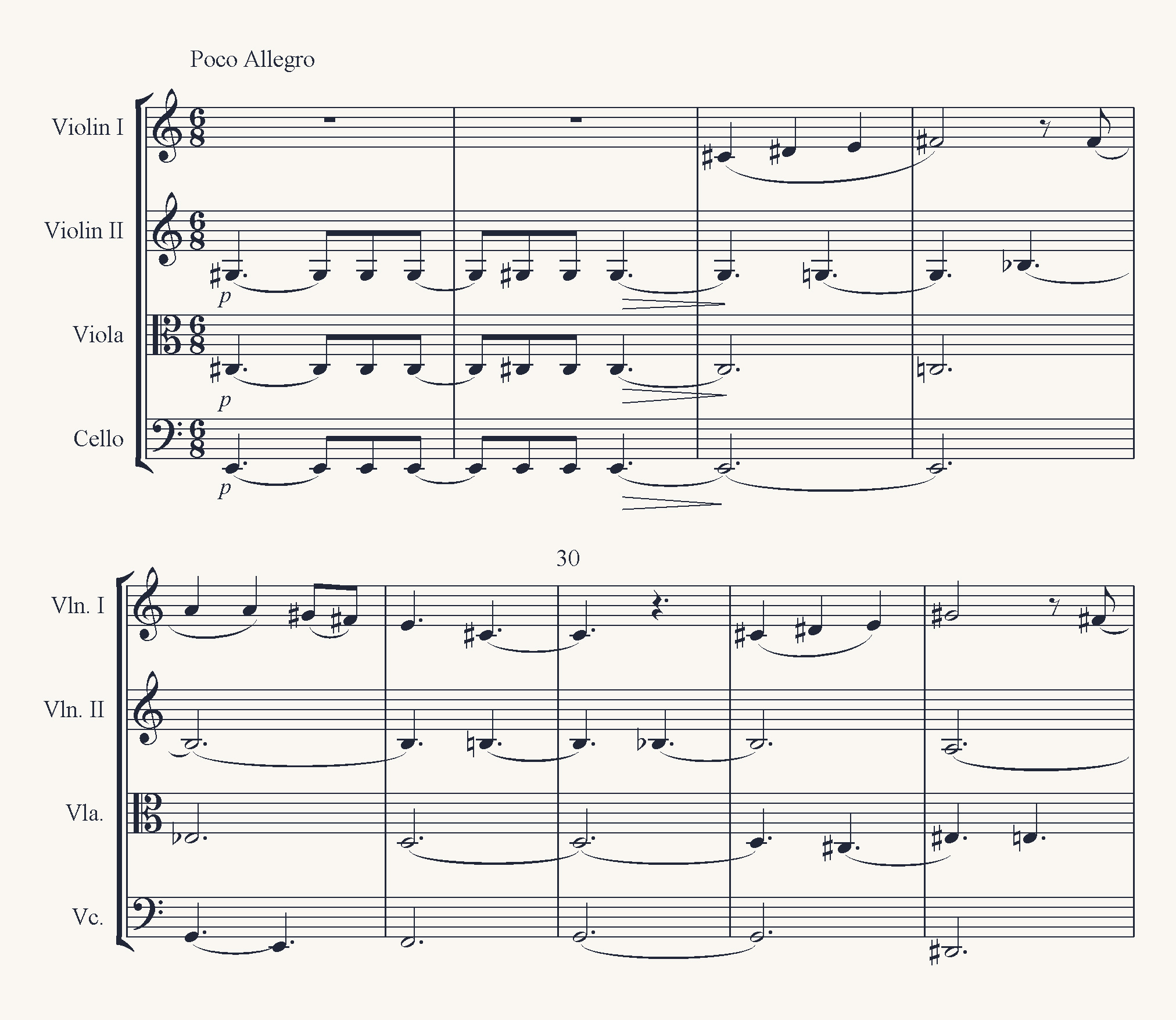 A sprightly, up-tempo theme drawing on material from the first movement of the string quartet Opening melody of Jara’s “Plegaria” played by violin (see accompanying score, Example 8.4)
